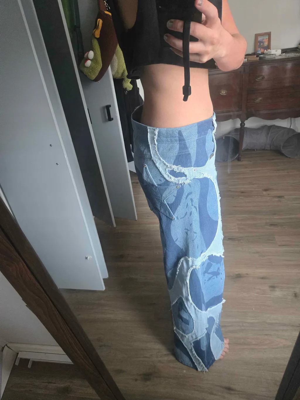 Tidal Pool Jeans feature a underwater aesthetic stone wash finish with silver metal hardware and a custom-embossed front button. Built with functional belt loops and dual-sided pockets.